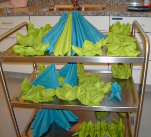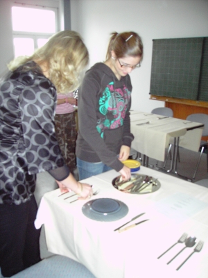 Beim Servietten brechen und Tisch eindecken zeigten alle viel Interesse und Elan. Beim gegenseitigen Getränkeservice und dem Servieren der Speisen, galt es sich als Servicekraft, sowie als Gast, sich zu behaupten und zu benehmen.